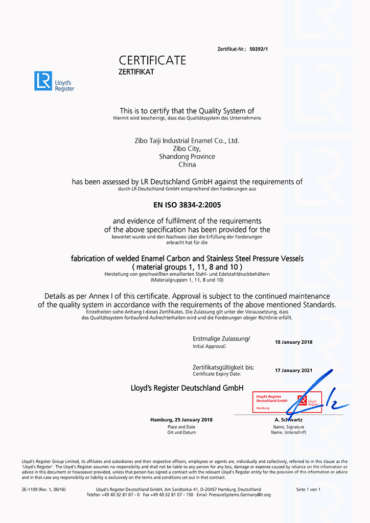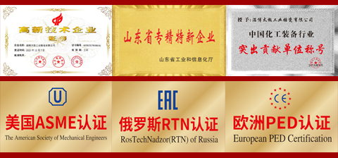 淄博太極在中國(guó)搪玻璃設(shè)備制造行業(yè)中首家通過(guò)ISO90001質(zhì)量體系認(rèn)證,并擁有美國(guó)ASME認(rèn)證、歐洲PED認(rèn)證以及國(guó)家部門(mén)頒發(fā)的搪玻璃制造許可證、進(jìn)出口許可證和百余項(xiàng)榮譽(yù)證以及三十六項(xiàng)專(zhuān)利等。