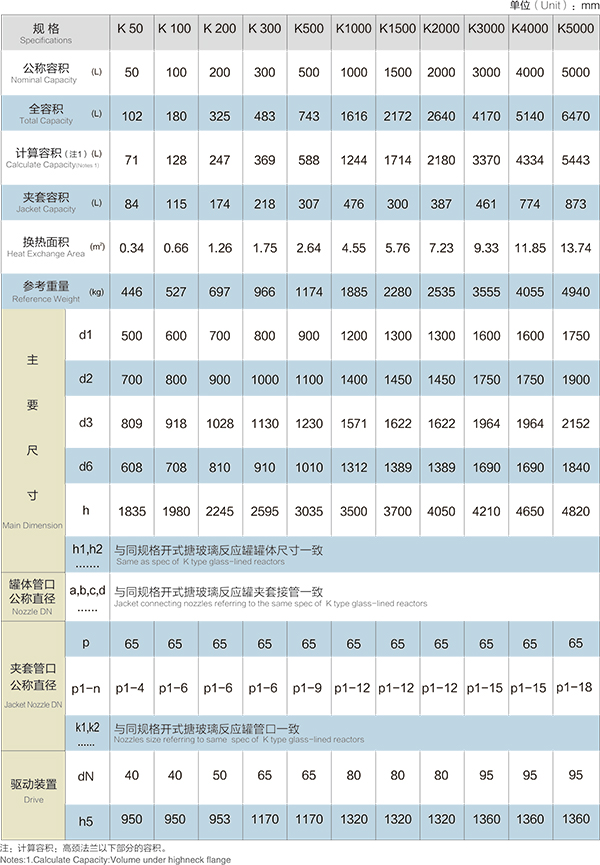 K50L-K5000L電加熱搪玻璃反應(yīng)釜(電加熱搪瓷反應(yīng)釜)設(shè)計(jì)圖紙及參數(shù)如下所示: