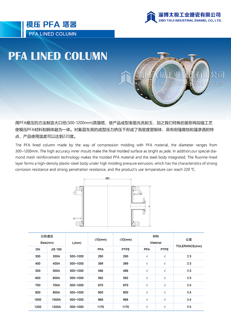 模壓PFA塔器 PFA LINED COLUMN 用PFA模壓的方法制造大口徑(300-1200mm)蒸餾塔,使產(chǎn)品成型表面光亮如玉,加之我們特殊的菱形網(wǎng)加強(qiáng)工藝使模壓PFA材料和鋼體融為一體。襯氟層在高的成型壓力擠壓下形成了高密度塑鋼體,具有耐強(qiáng)腐蝕和強(qiáng)滲透的特點(diǎn),產(chǎn)品使用溫度可以達(dá)到220度。